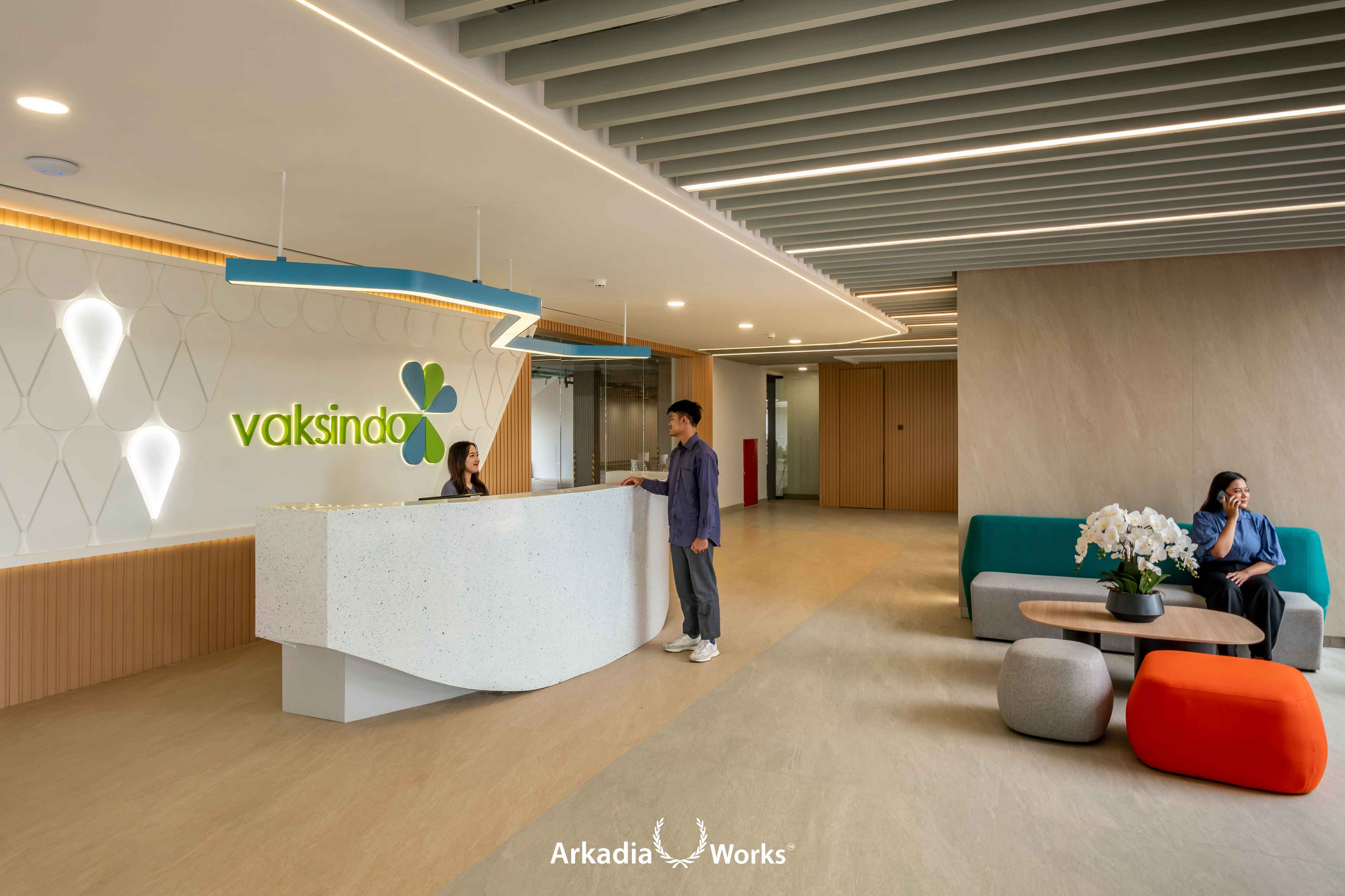 Inspired by the concept of Immunova Core, representing Immunity, Innovation, and Core, the office interior design reflects Vaksindo’s legacy as Indonesia’s first animal vaccine manufacturer. The space embodies a modern, laboratory inspired atmosphere through clean, dynamic forms and a vibrant palette of green and blue.